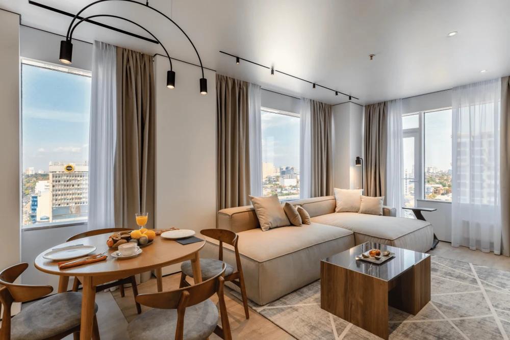 Апартаменты отеля включают спальни, гостиные и кухни, что создаёт ощущение домашнего уюта. Это позволяет Вам обустроиться так, как будто Вы находитесь дома, оставаясь в самом центре города и пользуясь услугами премиального отеля.
